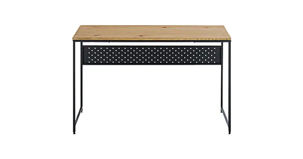 Der Schreibtisch Cori besteht aus einem standfesten Metallgestell mit dekorativer Knieraumblende aus perforiertem Metall. Die Tischplatte aus Dekor Wildeiche ist stilvoll auf dem Metallrahmen befestigt. Der industrielle Look passt besonders gut zu modernen Einrichtungen sowie Büroräumen. Dank seiner rechteckigen Form lässt sich der Schreibtisch gut neben bereits vorhandenen Möbel platzieren. Ein eleganter Arbeitsplatz für dein Home-Office!