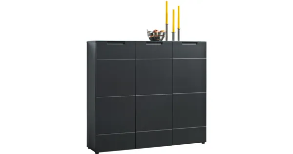 Der geräumige 3-türige Schuhschrank Mailand überzeugt nicht nur mit seiner klassischen Optik in mattem schwarz, sondern mit viel Stauraum, welche die acht Einlegeböden bieten. Der Oberboden ist...