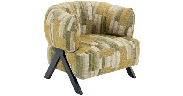 Dieser Sessel bringt Farbe und Komfort in dein Zuhause. Das markante Design mit geometrischem Muster in Grün und Beige macht ihn zu einem echten Blickfang. Die weiche Polsterung und die geschwungene Rückenlehne sorgen für bequemes Sitzen. Die stabilen Beine aus schwarzem Metall geben dem Sessel einen modernen Look und sicheren Stand. Perfekt, um zu entspannen oder deinem Raum einen stilvollen Akzent zu verleihen.