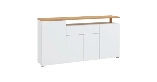 Das weisse Sideboard Aterno verwandelt dein Zuhause in ein modernes Wohnparadies. Mit seinen grosszügigen Massen von 180 x 94 x 40 cm bietet es reichlich Stauraum. Dank des raffinierten Push-to-Open-Mechanismus öffnen sich die vier Türen und die Schublade fast wie von selbst. Im Möbel sorgen vier Einlegeböden für Ordnung und Übersicht. Das Sideboard verfügt über eine Deckplatte in Dekor Eiche Artisan, die dem Möbel einen natürlichen Touch verleiht und jeden Raum optisch aufwertet.