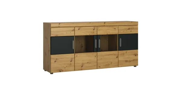 Das Sideboard Brixen in der Ausführung Dekor Eiche Artisan mit wertiger Echtholzstruktur, lässt einen ausgewogenen und Zeitlosen Gesamteindruck in Ihrem Wohnraum entstehen. Die Absetzungen der Fronten in Lavagrau verleihen dem Möbel Brixen Charakter. Abgerundet wird die edle Optik durch die getönten Rauchglasscheiben. Die LED-Beleuchtung setzt dezente Lichtpunkte, welche Ihrem Raum viel Charme verleihen. Das Sideboard Brixen bietet dank den vier Türen jede Menge Stauraum. Für ein wohliges und geschmackvolles zu Hause ist das Wohnprogramm Brixen genau das Richtige.