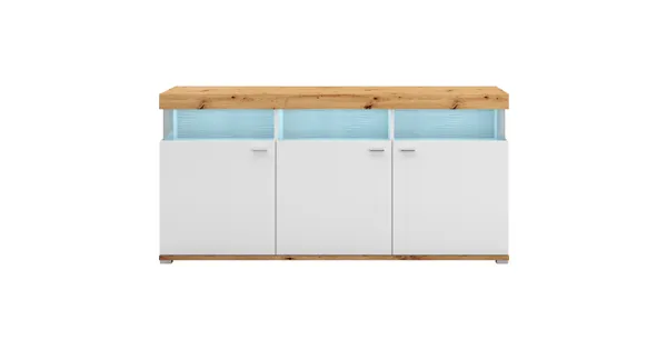 Das elegante Sideboard Corso in Melamin Weiss mit Artisan-Elementen ist ein echtes Highlight! Mit seinen stattlichen Massen von 180 x 88 x 41 cm bietet es viel Stauraum. Das Möbel verfügt über drei Türen mit Softclose-System und Glaseinsätzen. Zudem ist es mit einer LED-Beleuchtung ausgestattet, die für ein gemütliches Ambiente im Wohnzimmer sorgt.
