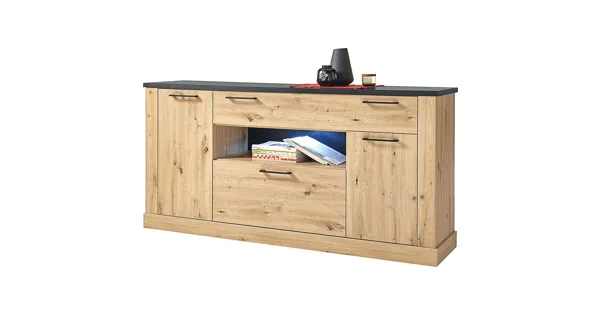 Mit dem Sideboard Lando kommt Ordnung in dein Wohnzimmer. Das Möbel verfügt über eine grosse Schublade, zwei Türen mit Einlegeböden und einem zusätzlichen verschliessbaren Fach mit Klappe. Die Stauraum-Möglichkeiten können rege mit Spiele, Bücher, Geschirr etc. befüllt werden. Inmitten des Sideboards befindet sich ein offenes Fach, das bei Bedarf mit LED beleuchtet werden kann. Es dient zur Ablage von Dekoelementen, Trophäen oder griffbereiten Alltagsgegenständen. Der Korpus und die Front sind in Dekor Eiche Artisan gehalten, die Abstellfläche und die Griffe heben sich farblich vom restlichen Möbel ab. Dieser Farbkontrast veredelt die Optik und lässt das Sideboard einfacher mit bereits bestehenden Möbelstücken kombinieren.