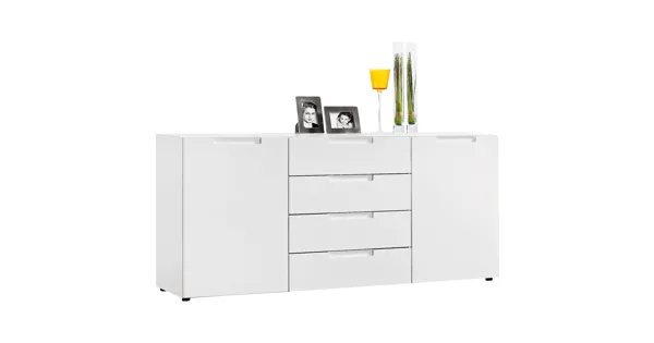 Sideboard MailandIm zeitlosen Design erstrahlt das Sideboard Mailand in jeder Wohnung. Die Front aus MDF Hochglanz sorgt zudem für einen seidigen Schimmer auf der Oberfläche. Der Stauraum für Ihre alltäglichen Dinge verbirgt sich hinter zwei Türen und vier praktischen Schubladen. Für alle, die gerne Farbakzente mit Accessoires setzen, ist das Sideboard Mailand das ideale Möbelstück.