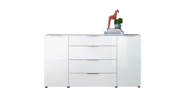 Entdecke das stilvolle Sideboard Santo, das deinem Zuhause einen Hauch von Eleganz verleiht. Mit seiner Grösse von 180 x 99 x 40 cm bietet es hinter den zwei Türen und in den vier Schubladen viel Stauraum. Die elegante Glasfront auf der weissen Melaminbeschichtung strahlt Modernität aus, während die verchromten Griffe und schwarzen Kunststofffüsse für den letzten Schliff sorgen. Die praktische Soft-Close-Funktion garantiert ein leises und sanftes Schliessen der Türen und Schubladen. Verleihe deinem Wohn- oder Esszimmer mit diesem tollen Möbelstück einen frischen Look. Ob für Geschirr, Bücher oder Dekorationen – Santo hält alles ordentlich verstaut.