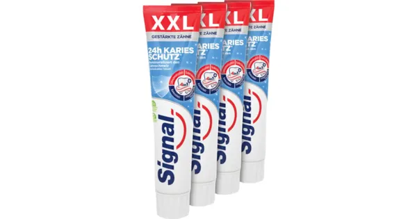 Die Zahnpasta Kariesschutz XXL von Signal bietet alles für nachhaltig gesunde und gestärkte Zähne. Dank dem rundum Schutz schützt die rot-weiss gestreifte Zahnpflege zuverlässig vor Karies, schützt den Zahnschmelz und sorgt für einen langanhaltenden frischen Atem.