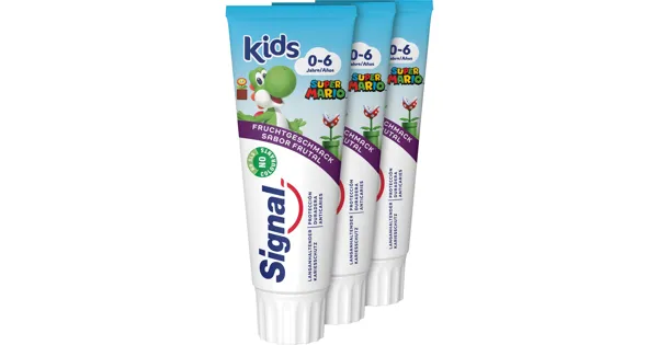 Sorge für strahlendes Kinderlächeln mit der Signal-Zahnpasta Kids. Diese speziell entwickelte Zahnpasta für Kinder im Alter von 1-6 Jahren bietet eine altersgerechte Menge an Fluorid, die hilft, den empfindlichen Zahnschmelz zu schützen und Karies vorzubeugen. Die sanfte Milchzahn-Formulierung begeistert die Kleinsten und sorgt dafür, dass Zähneputzen zu einem Spass für Kinder wird. Mit sicherem Schutz durch Signal ist die Zahngesundheit deiner Kinder in besten Händen.