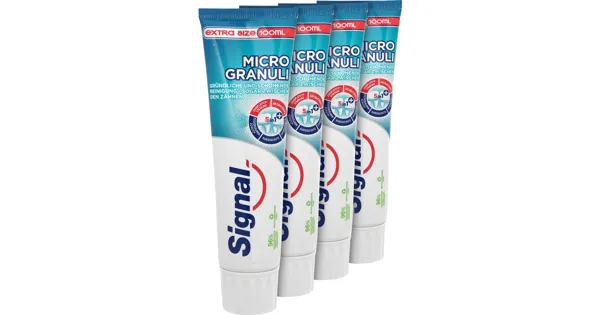 Die Signal Zahnpasta Micro Granuli ermöglicht eine gründliche und schonende Reinigung bis in die Zahnzwischenräume. Die weissen und grünen Micro-Granulaten entfernen Plaque wirksam und bieten einen nachhaltigen Schutz für Zähne und Zahnfleisch.