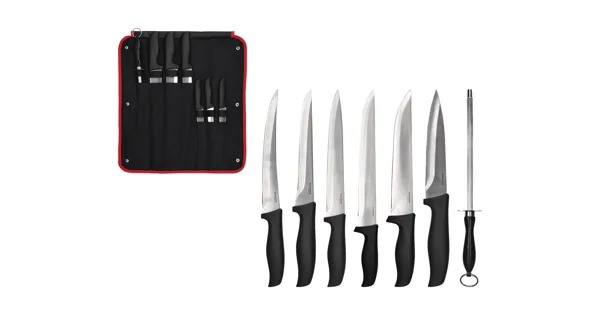 Set bestehend aus: Fleischermesser, Kochmesser, Tranchiermesser, Küchenmesser, Ausbeinmesser, flexibles Ausbeinmesser, Wetzstahl , Inkl. Tasche mit integriertem Klingenschutz und Druckknöpfen für mehr Sicherheit , Pro Set