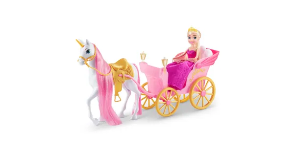 Mit dem ZURU Sparkle Girlz Prinzessin mit Einhorn und Kutsche Spielset fährst du in die magische Welt der Sparkle Girlz! Diese Prinzessin trägt ein wunderschönes Prinzessinnen-Outfit. Ihr königliches Einhorn ist mit Perlen verziert und hat langes, glitzerndes Haar zum stylen und spielen. Die Räder der Prinzessinnenkutsche drehen sich für unendlichen Spielspass.