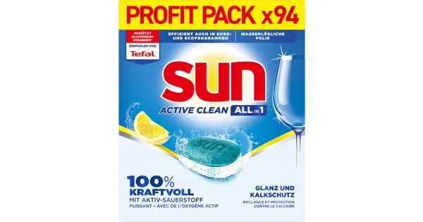 Die Sun Active Clean All-in-1 Tabs entfernen zuverlässig hartnäckige Flecken und sorgen bei jedem Spülgang für strahlend sauberes Geschirr. Die leistungsstarke Formel mit Aktiv-Sauerstoff löst selbst festgesetzte Verschmutzungen effektiv und sorgt für eine tiefenwirksame Reinigung – ganz ohne Vorspülen. Die praktischen Active Clean All-in-1-Tabs bieten höchsten Komfort und sind speziell darauf ausgerichtet, den Alltag zu erleichtern und stets ein makelloses Spülergebnis zu liefern.Dank ihrer modernen Wirkstoffkombination entfalten die Tabs auch bei niedrigen Temperaturen sowie in Eco- und Kurzprogrammen ihre volle Leistung. So sparen Sie Wasser, Zeit und Energie, ohne Kompromisse bei der Reinigung einzugehen.Mit ihrer umfassenden All-in-One-Formel schützen die Sun Active Clean All-in-1 Tabs zuverlässig vor Kalkablagerungen, verleihen Ihrem Geschirr brillanten Glanz und machen zusätzliche Produkte wie Regeneriersalz oder Klarspüler im Normalfall überflüssig.