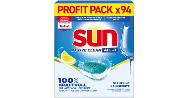 Die vollständige Lösung in einem Tab: Die leistungsstarke All-in-1 Active Clean Formel mit Aktiv-Sauerstoff entfernt selbst hartnäckige Flecken und garantiert glänzend sauberes Geschirr bei jedem Spülgang.Sun, die Geschichte einer umweltfreundlichen Marke:Seit mehr als 50 Jahren ist die Marke Sun bestrebt, sich ständig zu verbessern und innovative Produkte auf den Markt zu bringen. Somit erzielt Sun ausgezeichnete Ergebnisse und leistet gleichzeitig ihren Beitrag zu einer nachhaltigen Lebensweise.Die Tabs werden vollständig in Frankreich hergestellt, in einem Werk ohne CO2-Emissionen. Der Produktionsstandort recycelt alle seine Abfälle.