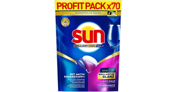 Die Sun Brilliant Shine All‑in‑1 Caps bieten eine kraftvolle Lösung für besonders gründliche Reinigung, strahlenden Glanz und effektive Fettlösekraft – bei jedem einzelnen Spülgang. Dank der innovativen Kombination aus Pulver, das für eine tiefenwirksame Reinigung und maximale Fettlösekraft sorgt, und Gel, das ein trockenes und glänzendes Spülergebnis ermöglicht, bietet ein einziger Cap die volle Leistung. – Zutaten: Inhaltsstoffe: 5-15%: Bleichmittel auf Sauerstoffbasis, Polycarboxylate. < 5%: Nichtionische Tenside, Phosphonate, Enzyme, Duftstoffe, Benzisothiazolinone. Zutaten: Inhaltsstoffe: 5-15%: Bleichmittel auf Sauerstoffbasis, Polycarboxylate. < 5%: Nichtionische Tenside, Phosphonate, Enzyme, Duftstoffe, Benzisothiazolinone.
