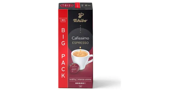 Röstkaffee, gemahlen Mit Cafissimo erleben Sie erlesene Kaffees aus einzigartigen Kaffeeanbaugebieten. Für jede unserer Aromakapseln verwenden wir beste Tchibo Kaffeebohnen, die in den sonnigen Anbauregionen langsam reifen. Entdecken Sie einen einzigartigen Espresso für leidenschaftliche Geniesser. Wenn Sie einen intensiven Espresso mögen, dann entscheiden Sie sich für den Espresso kräftig.Die Cafissimo 30er Vorratsbox bietet dank ihrer funktionalen Verpackung schnellen Zugriff auf die 30 einzeln enthaltenen Cafissimo Kapseln. Durch den praktischen Wiederverschluss lässt sie sich zudem ideal neben der Cafissimo Maschine oder im Küchenschrank verstauen und ist dabei durch ihr seitlich angeordnetes Design besonders schick. – Zutaten: Röstkaffee(100%). Zutaten: Röstkaffee(100%).