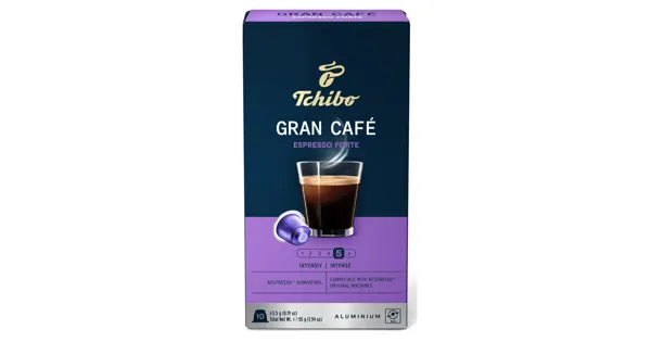 Röstkaffee, gemahlen Ein harmonischer Blend ausgewählter Arabica-Kaffees aus Süd- und Mittelamerika, nach traditionell italienischer Art geröstet und aromafrisch versiegelt. Entdecken Sie mit Tchibo Gran Café Espresso Forte intensiven und lebendigen Espressogenuss. Die Kapseln aus dem Tchibo Gran Café Sortiment sind kompatibel mit den gängigen Nespresso®*-Maschinen (Citiz, Citiz & Milk, Pixie, Inissia, Prodigio, Lattissima+, Lattissima Touch, Lattissima Pro) und lassen sich wie gewohnt über Ihre Nespresso®*-Maschine zubereiten. Dank der aromafrischen Versiegelung der Kapseln wird das Eindringen von Sauerstoff, Licht und Feuchtigkeit verhindert. So bleibt der Kaffee auch ohne zusätzliche Umverpackung frisch. Damit bietet Tchibo Gran Café eine umweltfreundlichere Alternative als andere Nespresso®*-kompatible Kapseln. – Zutaten: Röstkaffee(100%). Zutaten: Röstkaffee(100%).