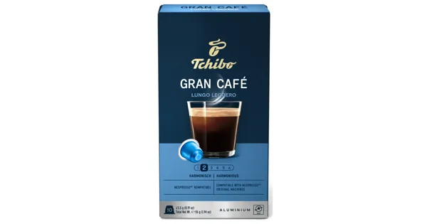 Röstkaffee, gemahlen Tchibo Gran Café - beste Kaffeequalität für Ihre Nespresso®* Maschine. Ein harmonischer Blend ausgewählter Arabica-Kaffees aus Süd- und Mittelamerika sowie Ostafrika. Nach traditionell italienischer Art geröstet und aromafrisch versiegelt. Entdecken Sie mit Tchibo Gran Café Lungo Leggero einen harmonischen Lungo mit angenehm getreidiger Note und fein-süsslichem Aroma.Recycling. So funktioniert's: Geben Sie Ihre Kapseln in Ihrer Tchibo Filiale oder bei Swiss Aluminium Capsule Recycling Partnern in der Schweiz ab. Erfahren Sie mehr auf: tchibo.ch – Zutaten: Röstkaffee(100%). Zutaten: Röstkaffee(100%).