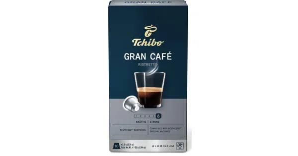 Röstkaffee, gemahlen Tchibo Gran Café - beste Kaffeequalität für Ihre Nespresso®* Maschine. Ein intensiver Blend ausgewählter Arabica-Kaffees aus Südamerika und indischem Robusta, nach traditionell italienischer Art geröstet und aromafrisch versiegelt. Entdecken Sie mit Tchibo Gran Café Ristretto einen kräftigen Ristretto mit feinbitterem Aroma und leicht hölzernen Noten.Recycling. So funktioniert's: Geben Sie Ihre Kapseln in Ihrer Tchibo Filiale oder bei Swiss Aluminium Capsule Recycling Partnern in der Schweiz ab. Erfahren Sie mehr auf: tchibo.ch – Zutaten: Röstkaffee(100%). Zutaten: Röstkaffee(100%).