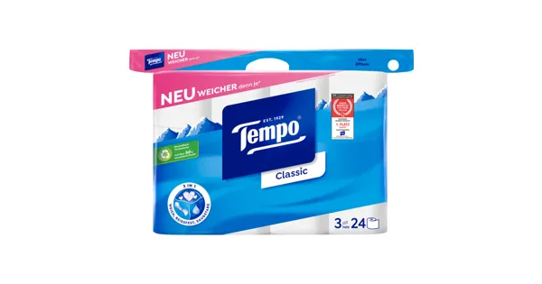 Angenehm weich für die ganze Familie Eine weiche Qualität mit flauschiger Volumenstruktur bietet unser Tempo Classic WC Papier. Mit seinen 3 weichen und strapazierfähigen Lagen ist es ideal für die ganze Familie und besonders sanft bei der Anwendung. Übrigens, für alle die es farbig mögen: Unser Tempo Toilettenpapier gibt es auch in blau. Die recycelbare Verpackung ist CO₂-reduziert und besteht aus über 50% recyceltem Plastik. Highlights:-Tempo Toilettenpapier angenehm weich und sanft-In modernem Packungsdesign-3 lagig weiss - auch in blau verfügbar-WC Papier mit 150 Blatt-Dermatologisch getestet-Verpackung aus über 50% recyceltem Plastik hergestellt und CO₂-reduziert Recyclingfähig gemäss ISO 18604, für verschiedene Verwendungszwecke. Das tatsächliche Recycling hängt von mehreren Faktoren ab, z.B. von der regionalen Verfügbarkeit eines Recyclingsystems. Reduzierung des CO₂-Fussabdrucks der Verpackung durch die Verwendung von recyceltem Plastik, basierend auf von Essity durchgeführten und von einer dritten Partei, verifizierten Lebenszyklusanalysen.