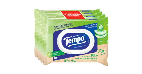 Mit den Tempo Feuchttüchern Sanft & Sensitiv bist du jederzeit bestens ausgestattet. Diese Tücher sind nicht nur mit beruhigender Aloe Vera angereichert, sie bestehen auch aus 100% natürlichen Fasern, die biologisch abbaubar und herunterspülbar sind. Deine Haut wird es dir danken, denn sie sind pH-hautneutral und dermatologisch getestet. Egal, ob zuhause oder unterwegs: Der praktische Feuchtigkeitsverschluss hält die Tücher stets frisch. Du bekommst ganze 4 x 42 Stück – also mehr Frische für weniger Aufwand. Ideal für die ganze Familie!