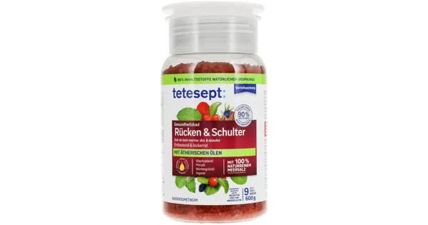 Kosmetikum tetesept Meeressalz Rücken & Schulter ist ein spezieller Badezusatz auf hautgesunder Meeressalz-Basis zur Förderung des Wohlbefindens bei Rücken-, Schulter- und Nackenbeschwerden. Die einzigartige tetesept-Kombinationenthält ätherische Öle aus:•Wacholder •Wintergrün • Ingwer •RosmarinDiese ausgewählte Kombination wurde auf die Bedürfnissebei Rückenbeschwerden abgestimmt. Die ätherischen Öleentfalten in Verbindung mit dem warmen Wasser ihrenlockernden und durchwärmenden Effekt an Rücken, Schulter und Nacken. Erleben Sie, wie sich Verspannungen lösenund das Wohlbefinden steigt. Zusätzlich pflegt das hautgesunde, naturreine tetesept Meeressalz mit MineralienIhre Haut auf natürliche Weise. – Zutaten: MARIS SAL, ROSMARINUS OFFICINALIS LEAF OIL, SALVIA SCLAERA FLOWER OIL, PIPER NIGRUM FRUIT OIL, ZINGIBER OFFICINALIS ROOT OIL, JUNIPERUS COMMUNIS FRUIT OIL, GAULTHERIA PROCUMBENS LEAF OIL, ZINGIBER OFFICINALE EXTRACT, CARTHAMUS TINCTORIUS SEED OIL, TOCOPHEROL, POLYSORBATE 20, SILICA, CITRAL, CITRONELLOL, GERANIOL, LIMONENE, LINALOOL, CI 16255, CI 42090 Zutaten: MARIS SAL, ROSMARINUS OFFICINALIS LEAF OIL, SALVIA SCLAERA FLOWER OIL, PIPER NIGRUM FRUIT OIL, ZINGIBER OFFICINALIS ROOT OIL, JUNIPERUS COMMUNIS FRUIT OIL, GAULTHERIA PROCUMBENS LEAF OIL, ZINGIBER OFFICINALE EXTRACT, CARTHAMUS TINCTORIUS SEED OIL, TOCOPHEROL, POLYSORBATE 20, SILICA, CITRAL, CITRONELLOL, GERANIOL, LIMONENE, LINALOOL, CI 16255, CI 42090
