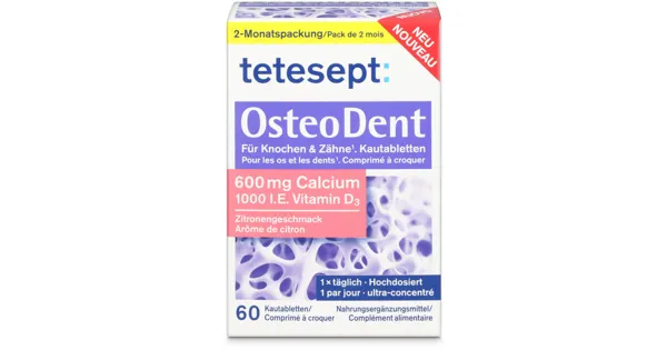 Nahrungsergänzungsmittel mit Süssungsmitteln Calcium ist ein wesentlicher Bestandteil unserer Knochen. Vitamin D3unterstützt als sogenannter Einbauhelfer die Aufnahme und den Einbauvon Calcium in die Knochen.Ein erhöhter Calciumbedarf kann bei Menschen ab 45 Jahren undspeziell bei Frauen inund nach den Wechseljahren bestehen.Die tetesept OsteoDent Kautabletten unterstützen Knochen und Zähne:• Calcium wird für die Erhaltung normaler Knochen und Zähnebenötigt.• Calcium und Vitamin D tragen dazu bei, den Verlust an Knochenmineralstoffenbei postmenopausalen Frauen zu verringern. Einegeringe Knochenmineraldichte ist ein Risikofaktor für durchOsteoporose bedingte Knochenbrüche.• Vitamin D trägt zu einem normalen Calciumspiegel im Blut bei.• Vitamin D trägt zur Erhaltung normaler Knochen bei. – Zutaten: Calciumcarbonat; Füllstoff: Sorbit; Säuerungsmittel: Zitronensäure; Trennmittel: Polyethylenglycol; Aroma: Zitrone; Cholecalciferol; Trennmittel: Magnesiumsalze der Speisefettsäuren; Süssungsmittel: Aspartam. Zutaten: Calciumcarbonat; Füllstoff: Sorbit; Säuerungsmittel: Zitronensäure; Trennmittel: Polyethylenglycol; Aroma: Zitrone; Cholecalciferol; Trennmittel: Magnesiumsalze der Speisefettsäuren; Süssungsmittel: Aspartam.