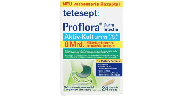 Nahrungsergänzungsmittel mit Milchsäurebakterien, Vitamin B1, Vatamin B2, Vitamin B6. Niacin, Folsäure und Inulin teteseptProflora®Darm Aktiv-Kulturen Kapseln unterstützen die Stabilisierung einer gesunden Darmflora und leisten einen wichtigen Beitrag: Zur normalen Funktion des Immunsystems dank Vitamin B6 und Folsäure. Zum Erhalt normaler Schleimhäute, wie auch derDarmschleimhaut, mit Vitamin B2 und Niacin. Zur Unterstützung der Darmgesundheit durch Vitamin B2 und Niacin. Als sinnvoller Begleiter nach einer Antibiotika-Therapie. Eine intakte Darmflora ist wichtig für ein funktionierendes Immunsystem. tetesept Proflora® Darm Aktiv-Kulturen Kapseln enthalten 8Mrd. Milchsäurebakterien ergänzt um darmgesunde Nährstoffe. Gluten- und laktosefrei. – Zutaten: Inulin; Füllstoff: Hydroxypropylmethylcellulose; Lactobacillus reuteri; Nicotinamid (Niacin); Trennmittel: Talkum, Siliciumdioxid;Lactobacillus rhamnosus; Trennmittel: Magnesiumsalze der Speisefettsäuren; Lactobacillus plantarum; Pyridoxinhydrochlorid; Riboflavin; Thiaminhydrochlorid; Pteroylmonoglutaminsäure. Zutaten: Inulin; Füllstoff: Hydroxypropylmethylcellulose; Lactobacillus reuteri; Nicotinamid (Niacin); Trennmittel: Talkum, Siliciumdioxid;Lactobacillus rhamnosus; Trennmittel: Magnesiumsalze der Speisefettsäuren; Lactobacillus plantarum; Pyridoxinhydrochlorid; Riboflavin; Thiaminhydrochlorid; Pteroylmonoglutaminsäure.