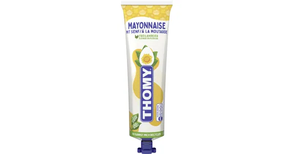 Mayonnaise mit Senf (12%) Entdecken Sie die Verbindung feinster Thomy Mayonnaise mit dem beliebtesten Senf der Schweizer, dem milden Senf von Thomy! Hiertrifft der cremige, weiche Geschmack der Mayonnaise auf die angenehme Schärfe des Senfs. Hergestellt mit Eiern aus Freilandhaltung und mit Senfkörnern verfeinert – endlich eine Mayo mit Charakter. Überzeugen Sie sich am besten selbst! Die Mayonnaise mit Senf von Thomy ist das Tüpfelchen auf einfach allem: zu hartgekochten Eiern, frischem Brot, Kartoffelsalat, auf Burgern, PommesFrites, grilliertem Steak und Fisch, Salat und knackigem Gemüse. – Zutaten: Sonnenblumenöl*, Tafelessig*, Wasser*, EIGELB* 4.9%, SENFSAMEN* 2.5%, jodiertes Salz*, Zucker, Salz, Hefeextrakt, Gewürze*, Gewürzextrakte. Zutaten: Sonnenblumenöl*, Tafelessig*, Wasser*, EIGELB* 4.9%, SENFSAMEN* 2.5%, jodiertes Salz*, Zucker, Salz, Hefeextrakt, Gewürze*, Gewürzextrakte.