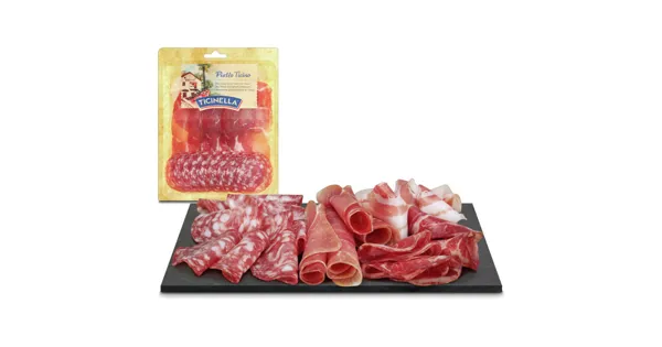 Fleischerzeugnis zum Rohessen (Rohschinken 41%, Pancetta arrotolata 20%,Coppa 20%, Salami 19%) Ticinella Piatto Ticino. Fleischerzeugnis zum Rohessen. E LA VITA È BELLA – Zutaten: Schweinefleisch, Speck, Rindfleisch, Nitritpökelsalz (Kochsalz, Konservierungsstoff [E 250]), Traubenzucker, Zucker, Maltodextrin, Gewürze, Konservierungsstoff (E 252), Antioxidationsmittel (E 301, E 392), natürliche Aromen. Zutaten: Schweinefleisch, Speck, Rindfleisch, Nitritpökelsalz (Kochsalz, Konservierungsstoff [E 250]), Traubenzucker, Zucker, Maltodextrin, Gewürze, Konservierungsstoff (E 252), Antioxidationsmittel (E 301, E 392), natürliche Aromen.