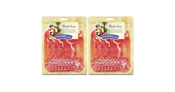 Fleischerzeugnis zum Rohessen (Rohschinken 41%, Pancetta arrotolata 20%,Coppa 20%, Salami 19%) – Zutaten: Schweinefleisch, Speck, Rindfleisch, Nitritpökelsalz (Kochsalz, Konservierungsstoff [E 250]), Traubenzucker, Zucker, Maltodextrin, Gewürze, Konservierungsstoff (E 252), Antioxidationsmittel (E 301, E 392), natürliche Aromen. Zutaten: Schweinefleisch, Speck, Rindfleisch, Nitritpökelsalz (Kochsalz, Konservierungsstoff [E 250]), Traubenzucker, Zucker, Maltodextrin, Gewürze, Konservierungsstoff (E 252), Antioxidationsmittel (E 301, E 392), natürliche Aromen.