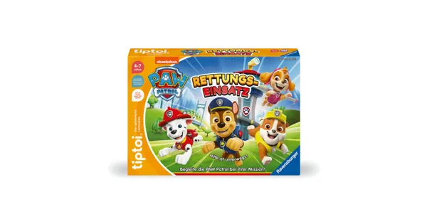 Hier ist die mutige PAW Patrol gefragt! Ob zu Wasser, in der Luft oder an Land - die Retter auf vier Pfoten erfüllen spannende Missionen. Für jeden Einsatz stellen die Kinder ein Hundeteam entsprechend der geforderten Fähigkeiten und Attribute zusammen. Muss ein Feuer gelöscht werden? Dann ist Marshall die beste Wahl. Wird eine Person vermisst? Spürnase Chase ist in dem Fall der perfekte Hund. Sobald das Team steht, führen die Kinder mit den Hunden die Rettungsmission durch.tiptoi-Stift nicht enthalten. Muss separat erworben werden.