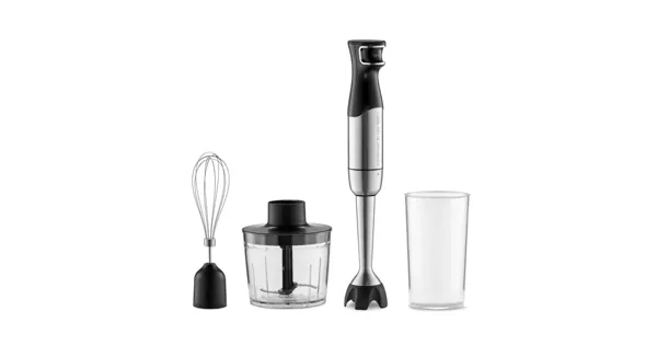 Flexibles Messer passt sich dem Druck an – für feinstes Pürieren und Mixen. 1500 W Hochleistungsmotor für harte und weiche Zutaten. Stufenlose Geschwindigkeitsregelung für perfekte Kontrolle. Ergonomisches Design für komfortables, einhändiges Arbeiten. Edelstahl-Mixstab – robust, langlebig und leicht zu reinigen. Mit praktischem Zubehör: Messbecher, Schwingbesen und Zerkleinerer.
