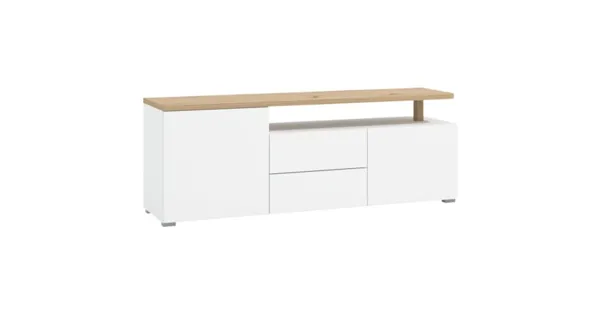 Einen modernen Touch erhält dein Wohnzimmer durch das stilvolle TV-Möbel Aterno in Dekor weiss. Das durchdachte Design mit der Deckplatte in Eiche Artisan verleiht dem Raum Wärme und Eleganz. Mit einer Breite von 154 cm bietet es genug Platz für einen Fernseher und andere Dekorationsartikel. Die praktische Aufteilung mit zwei Türen und zwei Schubladen mit Push-to-Open-Mechanismus sorgt für ordentlich Stauraum und das alles ohne sichtbare Griffe.