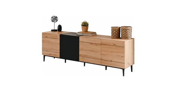 Mit dem TV-Möbel Joe holst du dir zeitlose Eleganz und funktionales Design in dein Wohnzimmer. Das hochwertige Möbelstück besticht durch seine Kombination aus edler Eiche und elegantem schwarzem Dekor. Die grosszügigen 4 Türen und 4 Einlegeböden bieten ausreichend Stauraum für deine Multimedia-Geräte und persönlichen Gegenstände, während das ansprechende Design einen Blickfang in deinem Wohnraum darstellt. Joe ist die perfekte Ergänzung für alle, die Wert auf Qualität, Ästhetik und praktische Funktionalität legen.