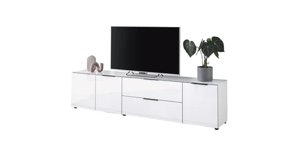Suchst du ein stilvolles und praktisches TV-Möbel? Dein Wohnzimmer verdient den modernen Touch des TV-Möbels Santo. Mit klaren Linien und zeitlosem Design sorgt es für einen Blickfang in jedem Raum. Die Kombination aus robusten Spanplatten und einer edlen Glasoberfläche in strahlendem Weiss wird dich und deine Gäste beeindrucken.