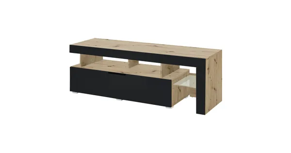 Das TV-Möbel Score ist ein Must-have für alle, die gerne stilvoll eingerichtet sind. Das elegante Schwarz in der Front harmoniert hervorragend mit der Eichenholzoptik des restlichen Möbels und verleiht ihm ein luxuriöses Erscheinungsbild. Als Highlight fungiert eine kleine Glasablage, die mit LED beleuchtet werden kann. Um den Platz optimal zu nutzen, ist das Lowboard mit mehreren offenen Fächern und zwei geschlossenen Fächern ausgestattet, die mit einer Klappe geöffnet werden können.