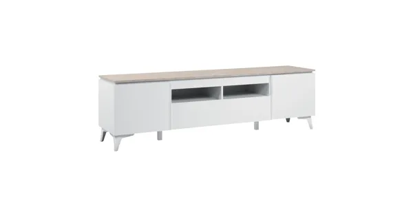 Das TV-Möbel Trix punktet mit seiner besonderen Deckplatte. Die Spanplatte mit Sandsteinoptik ist ein echter Hingucker! Der weisse Korpus und die weissen ausgestellten Füsse runden den Look stilvoll ab. Zudem verfügt das Möbel über eine Schublade, zwei Türen und zwei offene Fächer. Letztere können optimal für TV-Boxen, Modem und Game-Konsolen genutzt werden.