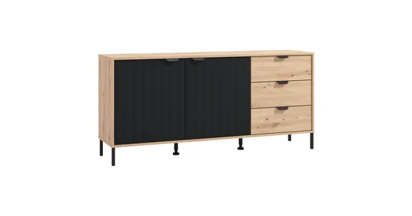 Das schlichte TV-Möbel Vandea ist mit zwei Türen und drei geräumigen Schubladen ausgestattet, die reichlich Stauraum für DVDs, Spielekonsolen und andere Mediengeräte bieten. Mit einer Länge von 157 cm bietet das Möbel eine ideale Ablagefläche für deinen Fernseher und andere Gegenstände. Die wellenförmigen, matt schwarzen Fronten und die schwarzen Metallgriffe sorgen für einen eleganten Kontrast zum restlichen Möbel, das in Eichendekor gehalten ist.