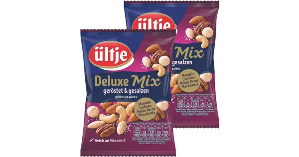 Nussmischung, geröstet und gesalzen Warum sich für eine Nuss entscheiden, wenn man gleich vier auf einmal naschen kann? Der Deluxe-Mix von ültje bietet die volle Auswahl: Leckere Mandeln, knackige...