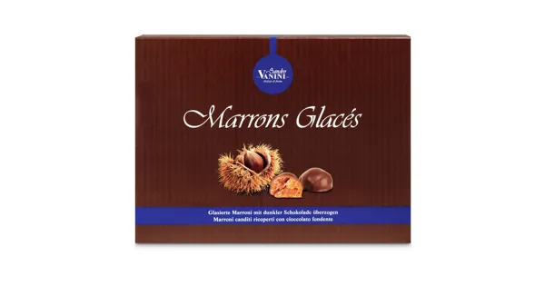 Kandierte Marroni mit dunkler Schokolade überzogen – Zutaten: Zucker, Glukosesirup, Kastanien 39%, Dunkle Schokolade 10% (Kakaomasse, Kakaobutter, Konservierungsstoff: Kaliumsorbat; Emulgator:...