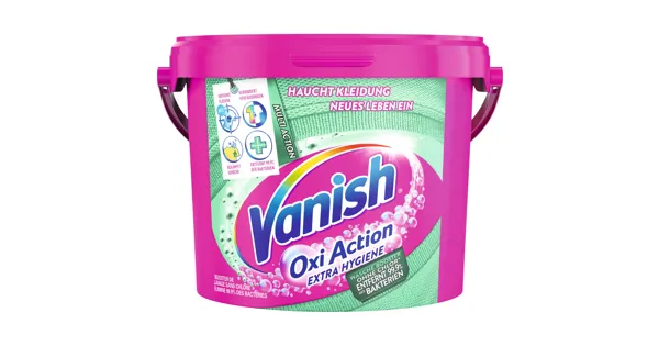 Das Oxi Action Hygiene Pulver von Vanish verleiht Ihrer Kleidung eine hygienisch saubere Frische. Dieser hochwirksame Fleckenentferner entfernt selbst hartnäckige Verschmutzungen wie Fettflecken und unangenehme Gerüche. Durch spezielle Inhaltsstoffe werden 99,9 % der Bakterien aus der Kleidung eliminiert. Geniessen Sie eine makellose und hygienische Wäsche, unabhängig von der Farbe – ob bunt oder weiss.