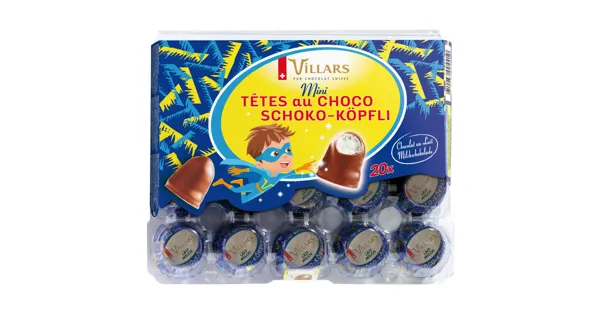 Schokolade-Confiserie Ein cremiger und leichter Schaum, überzogen von einer feinen Schicht knuspriger Villars Schokolade und ohne Palmöl. Die nationale Marke Nr. 1 in der Schweiz. – Zutaten: Zucker*, Kakaobutter, Dextrose, Glukosesirup, VOLLMILCHPULVER*, Kakaomasse, Invertzucker, Feuchthaltemittel (Sorbit), Waffel (WEIZENMEHL, Sonnenblumenöl, Salz, Emulgator (SOJALECITHIN), Backtriebmittel (E500)), MAGERMILCHPULVER*, EIWEISSPULVER*, MOLKENPULVER*, Malzextraktpulver (GERSTE), Verdickungsmittel (Agar-Agar), Aromen, Emulgator (SOJALECITHIN), Säuerungsmittel (Zitronensäure). Kakao: 36% mindestens in der Schokolade. Kann Spuren von HASELNÜSSEN, MANDELN, WALNÜSSEN, PEKANNÜSSEN, CASHEWNÜSSEN und PISTAZIEN enthalten.*Zutaten aus der Schweiz. Zutaten: Zucker*, Kakaobutter, Dextrose, Glukosesirup, VOLLMILCHPULVER*, Kakaomasse, Invertzucker, Feuchthaltemittel (Sorbit), Waffel (WEIZENMEHL, Sonnenblumenöl, Salz, Emulgator (SOJALECITHIN), Backtriebmittel (E500)), MAGERMILCHPULVER*, EIWEISSPULVER*, MOLKENPULVER*, Malzextraktpulver (GERSTE), Verdickungsmittel (Agar-Agar), Aromen, Emulgator (SOJALECITHIN), Säuerungsmittel (Zitronensäure). Kakao: 36% mindestens in der Schokolade. Kann Spuren von HASELNÜSSEN, MANDELN, WALNÜSSEN, PEKANNÜSSEN, CASHEWNÜSSEN und PISTAZIEN enthalten.*Zutaten aus der Schweiz.