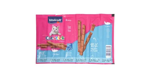 Die Cat Sticks Classic Lachs von Vitakraft dienen als Zwischenmahlzeit oder kleine Belohnung. Mit einem hohen Anteil an Fleisch und Fisch (95%).