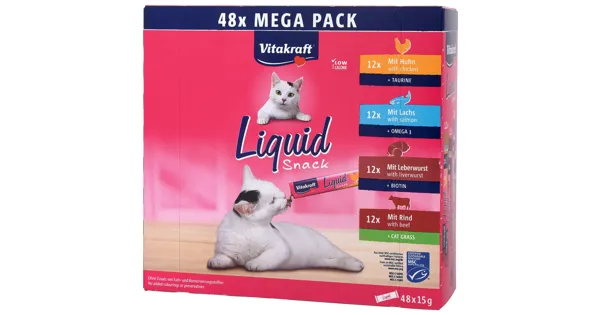 Der Vitakraft Liquid Snack begeistert nicht nur durch seinen leckeren Geschmack, sondern auch durch seine gesunden Inhaltsstoffe. Deine Katze wird jedes der 48 Snacks in den Geschmacksrichtungen Huhn, Lachs, Rind und Leberwurst lieben. Jeder Bissen ist mit wertvollem Taurin, Omega-3-Fettsäuren und Biotin angereichert – perfekt für ein glänzendes Fell und eine aktive Lebensweise. Und das Beste: Ohne Zusatz von künstlichen Farb- und Konservierungsstoffen. Die praktische Portionsgrösse macht es besonders einfach, deiner Samtpfote eine Belohnung zwischendurch zu gönnen. Gönn' deinem Liebling den ultimativen Snackgenuss!