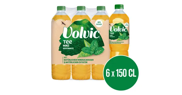 Erfrischungsgetränk mit natürlichem Mineralwasser Volvic und natürlichen Minz- und Grüntee-Extrakten. Ohne Kohlensäure Eistee auf Basis von natürlichem Mineralwasser, Minz- und Grüntee-Extrakten....