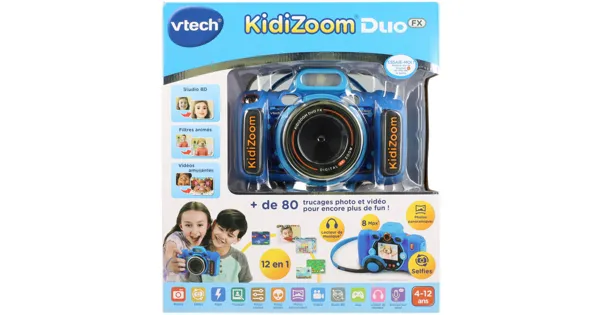 Die KidiZoom Duo FX ist eine Kamera im Vintage-Look, die speziell für Kinder entwickelt wurde. Sie verfügt über innovative Funktionen wie eine Frontkamera mit 8,0 Megapixel Auflösung und eine Rückkamera mit 2,0 Megapixel. Mit dem Comic-Studio können Kinder ihr Gesicht in eine Figur verwandeln und in der Galerie ihre Comic-Gesichter wiederfinden. Die lustige Crea-Funktion ermöglicht es, lustige Filter auf das Kinn zu setzen. Ausserdem gibt es neue Augmented-Reality-Avatare und 4 neue Spiele. Die Kamera bietet auch Foto- und Videotricks sowie die Möglichkeit, die eigene Stimme aufzunehmen und zu verzerren. Mit einem grossen Farbbildschirm kann man sehen, was man filmt und seine Aufnahmen überprüfen. Weitere Funktionen sind Gesichtserkennung für Selfies, Gesichtsanalyse, die sagt, ob eine Person lustig oder intelligent ist, die Möglichkeit, Gruppenfotos zu machen und sein Selbstporträt hinzuzufügen, sowie der Diashow-Modus für lustige Effekte beim Schütteln der Kamera. Die Kamera ist einfach zu bedienen und sehr robust mit einem stossfesten Gehäuse und Hitzeschutz.
