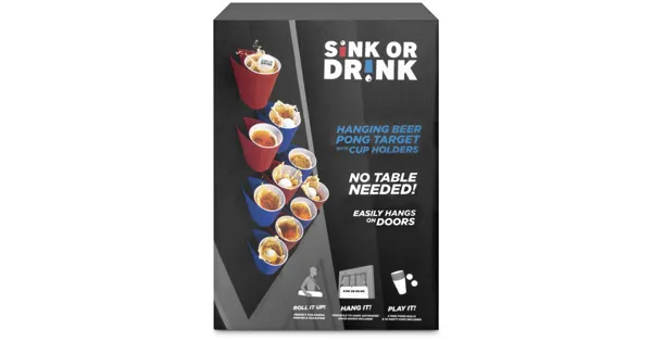 Überdenke die Art und Weise, wie du Bierpong spielst! Sink or Drink ist ein aufhängbares Bierpong-Ziel mit farblich gekennzeichneten Becherhaltern für Teams. Vergiss das Aufstellen eines Tisches. Spiel vertikal und spare Platz! Sink or Drink lässt sich leicht an der Rückseite von Türen (Haken im Lieferumfang enthalten) oder anderen Orten aufhängen. Enthält 10 Partybecher, 2 Tischtennisbälle und 2 Türhaken. Die Hülsen halten Standard-Partybecher. Inklusiv Zielscheibe mit Tasche für die Tischtennisbälle. Stark und stabil, damit das Gewicht der gefüllten Becher gehalten werden kann. Verstellbare Gurte zum Anheben oder Absenken der Höhe. Inklusiv aufrollbaren Schulterriemen. Kein Tisch erforderlich. Geeichnet für Personen ab 16 Jahren (gesetzliches MIndestalter).