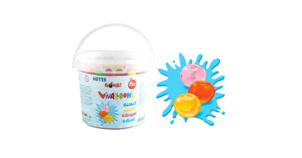Coole Wasserballone aus Naturkautschuk-Latex. 250 Stück in einem Eimer mit Deckel und Henkel. Durchmesser 8cm, Umfang 25cm.