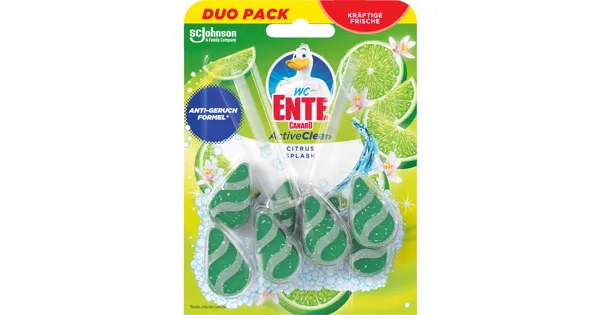 Der WC-Einhänger Active Clean Citrus von WC-Ente sorgt für hygienische Frische bei jedem Spülgang. Er kann leicht unter dem Rand der Toilettenschüssel angebracht werden. Wenn das Wasser auf den WC-Cleaner trifft, entsteht ein Schaum, der die WC-Schlüssel kraftvoll reinigt. Er hinterlässt einen angenehmen und langanhaltenden Duft nach Citrus.