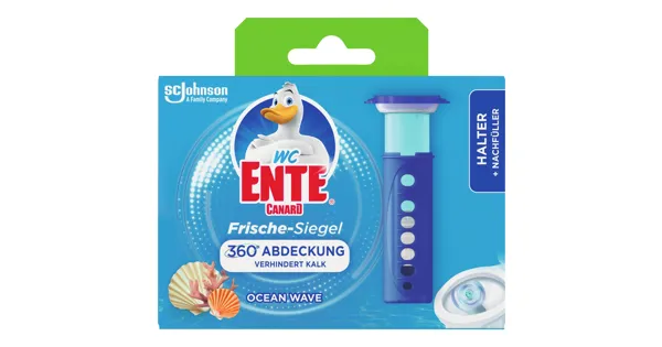 Das Starter Kit Frische-Siegel Ocean Waves von WC Ente verhindert Kalk- und Bakterienablagen in der Toilette und überdeckt nicht nur Gerüche, sondern neutralisiert sie auch. Dank der einfachen Handhabung mit dem Applikator bleiben deine Hände sauber. Lästige Einhängebügel gehören der Vergangenheit an. Bei jeder Spülung wird das Frische-Siegel aktiviert und sorgt für Hygiene und Sauberkeit. Der Applikator kann wiederverwendet werden.