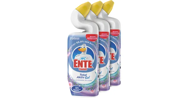Das WC Ente-Reinigungsgel Total Aktiv Lavender Bloom tötet bis zu 99,9% der Keime und Bakterien und sorgt für ein hygienisch reines WC und einen langanhaltenden Duft nach Lavendel. Der praktische Entenhals vereinfacht das Reinigen von schwer zugänglichen Stellen in der Toilette. Der Umwelt zuliebe wird die entenkopfförmige Flasche aus 50% recyceltem Plastik hergestellt.